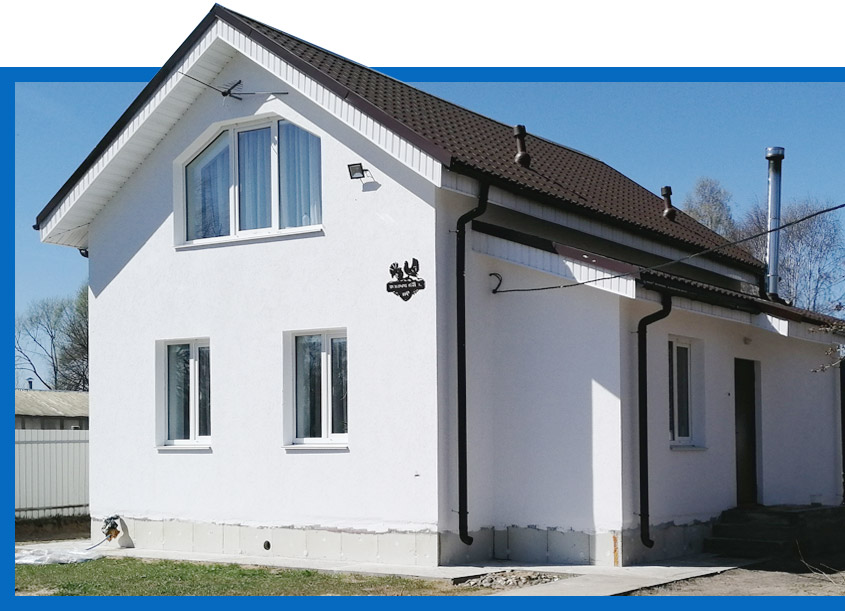 Дом построен для постоянного проживания. Этот проект — реконструкция дома размером 10 на 10 метров. Пристроили гараж со смотровой ямой и отводом воды для мойки автомобиля, комнату отдыха над гаражом, и входную зону. Кровля из металлочерепицы была демонтирована и заменена на мягкую.